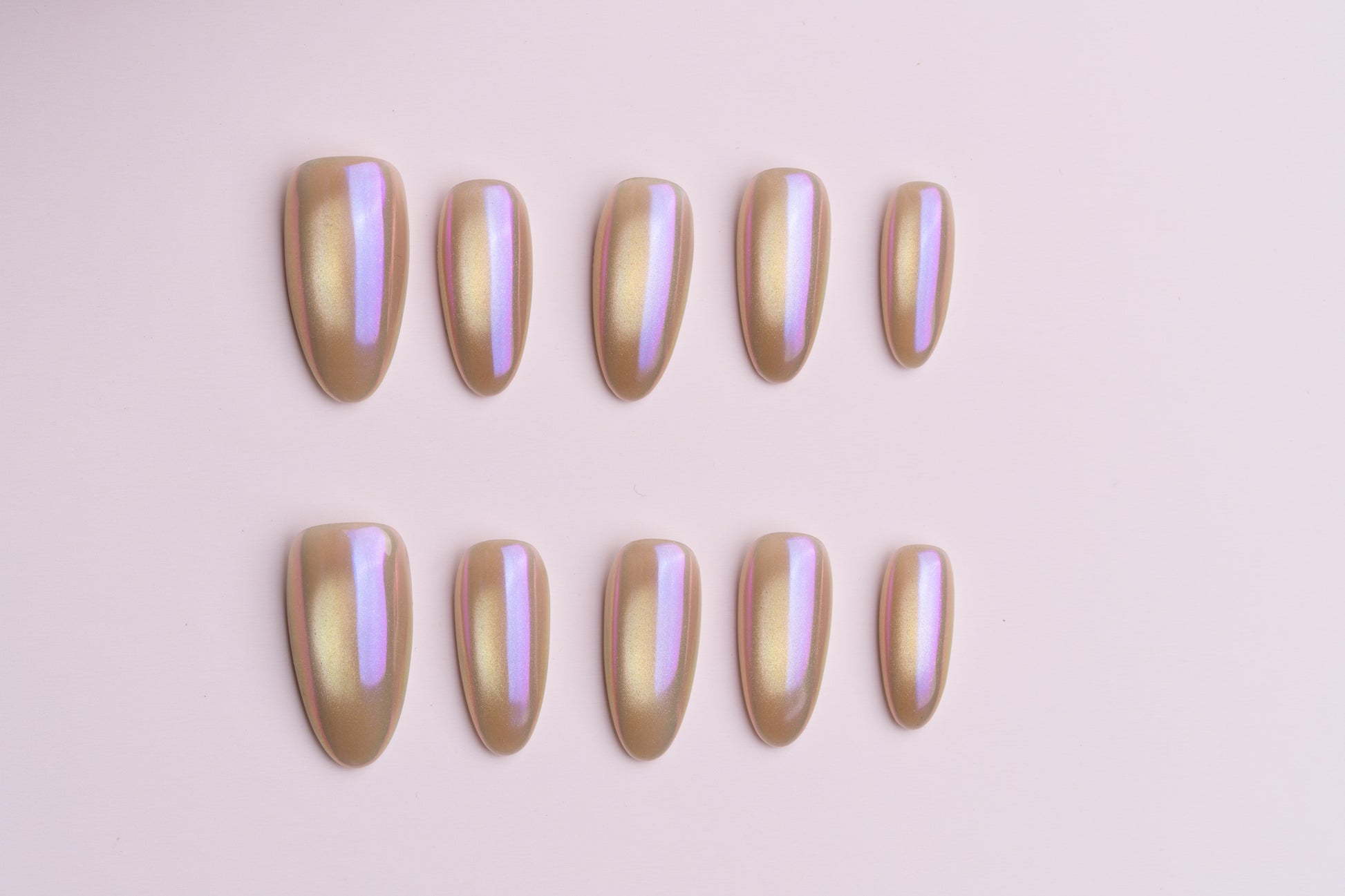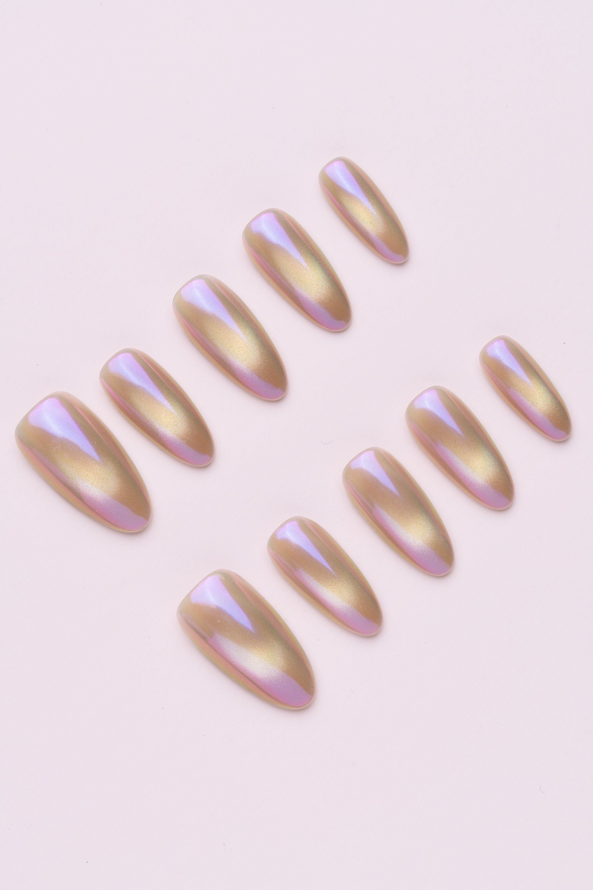 色彩灵感:源于极光与金属质感的碰撞,摒弃了传统金色的厚重感,用通透的裸粉猫眼打底,再覆上一层轻薄的极光粉,让甲面在光线下呈现流动的虹彩渐变,既保留了金色的贵气,又增添了梦幻空灵的氛围。