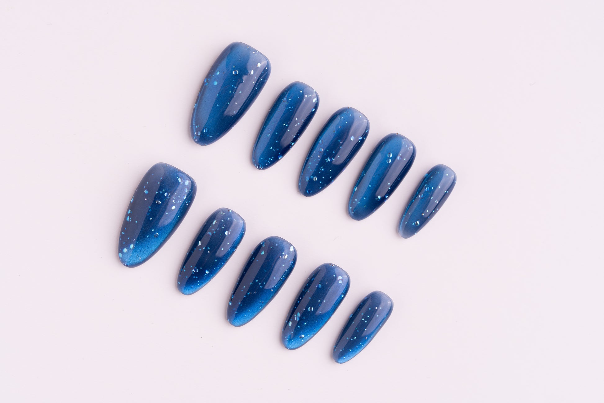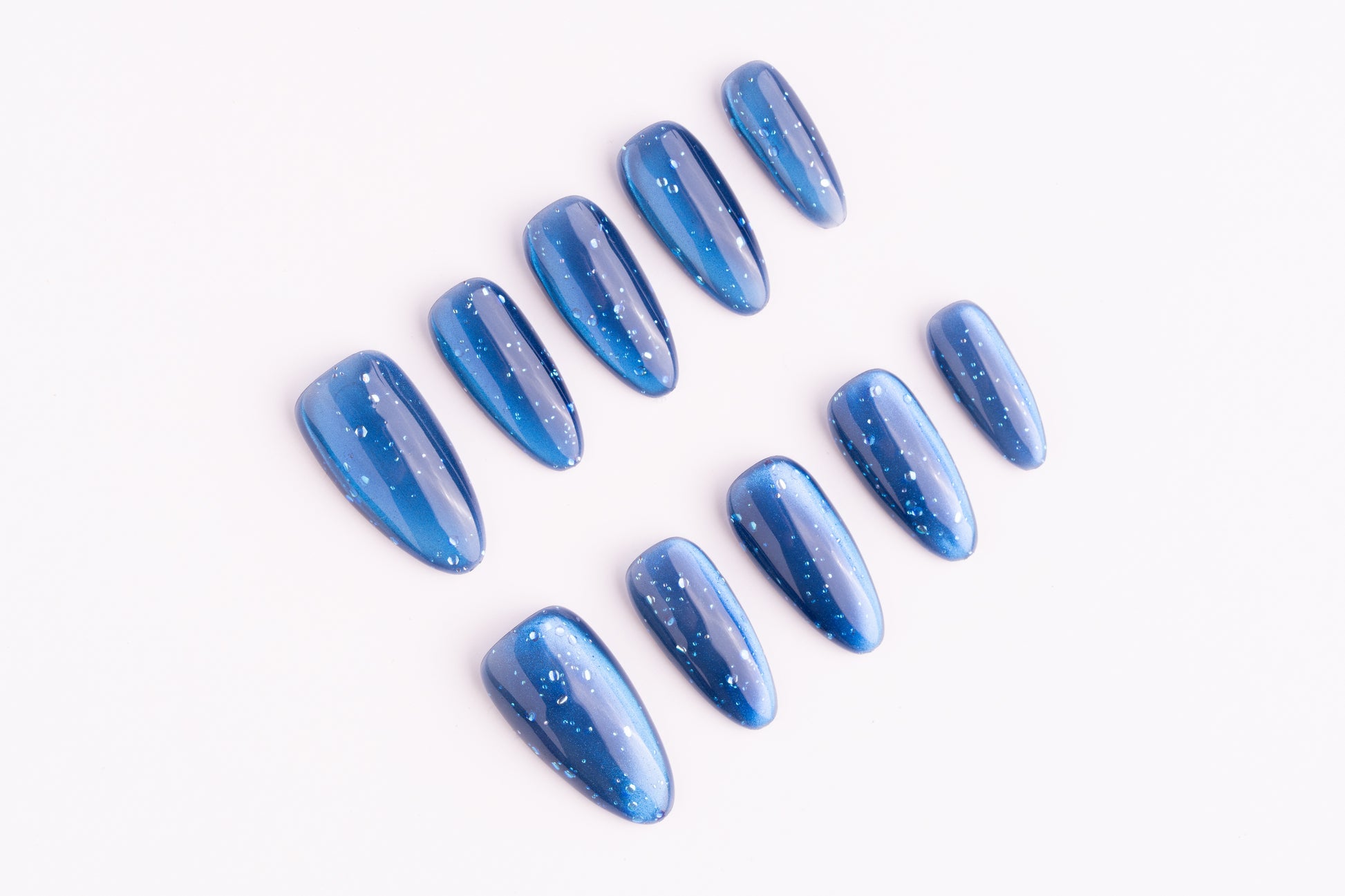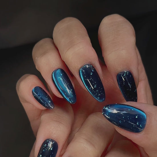 視覺亮點:以純色 + 測光貓眼+手工氣泡為核心設計,用不均勻分佈的氣泡打破單調,既保留了純色美甲的乾淨利落,又透過光影變化賦予甲面夢幻層次感,在不同光線下會呈現出深淺不一的藍調與氣泡細光。